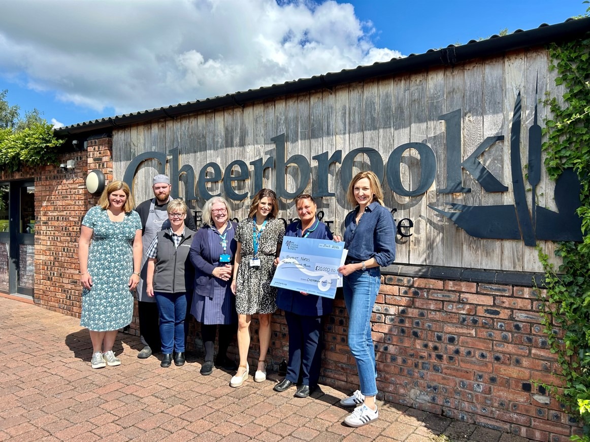 Sarah Shufflebotham, Cheerbrook Farm Shop colleagues and Mid Cheshire Hospitals Community District Nursing team meet at Cheerbrook Farm Shop in 2024 to celebrate the money raised and launch of the complementary therapies service