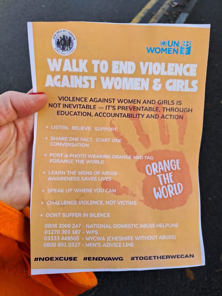 Participants wore orange—the official colour chosen by UN Women to symbolise a brighter future free from violence—and walked together in solidarity from Queens Park to Crewe Market Hall.